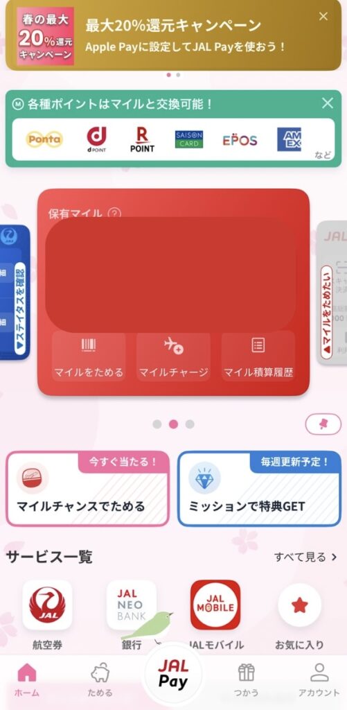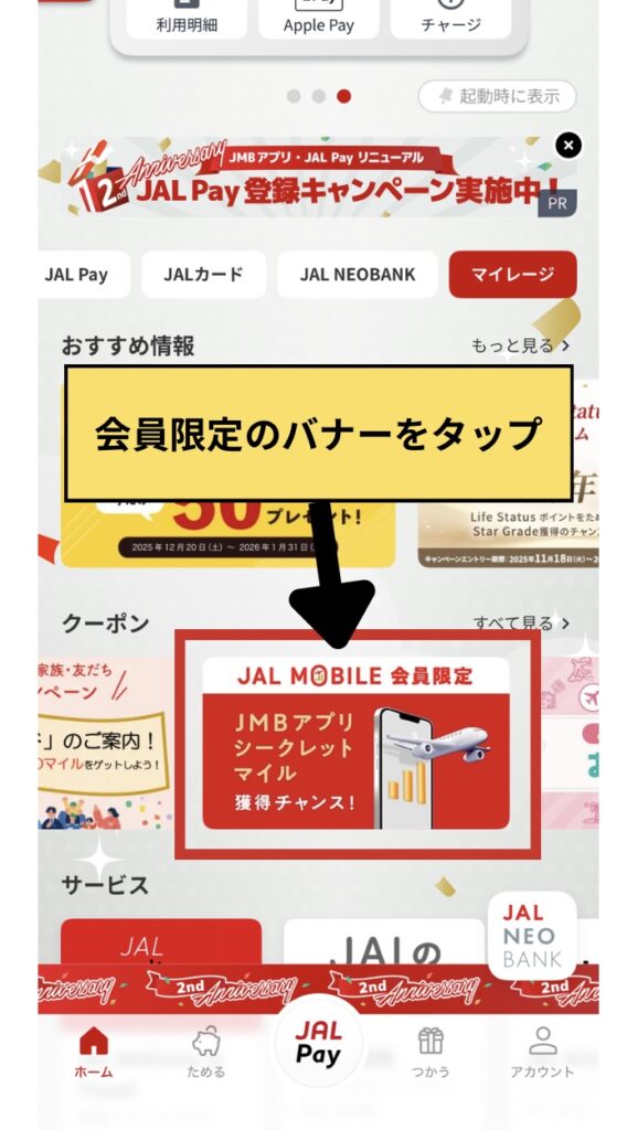 初見ではかなり分かりづらいのですが、JAL Payの画面に移動しないのと、マイレージのバナー出現しないので注意です。