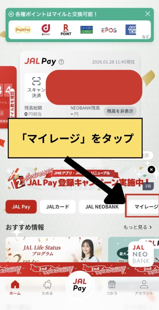 アプリ内でJAL Payの画面にスライドし、「マイレージ」のバナーをタップ