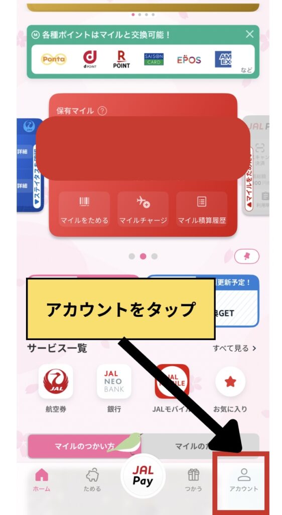 「JAL マイレージバンク」の画面で右下に表示してある「アカウント」をタップします。