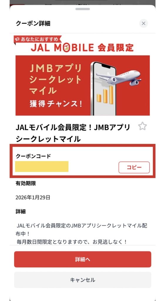 マイレージのバナーをタップするとクーポンの欄に「JAL Mobile会員限定」といったバナーが出現していますので、タップします。