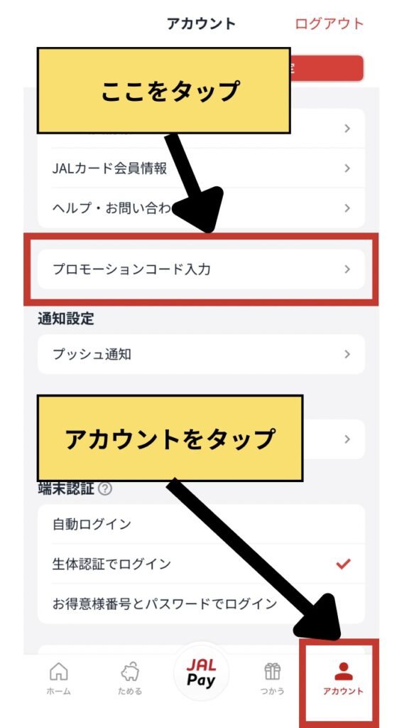 その後、「プロモーションコード入力」の項目がありますのでタップします。